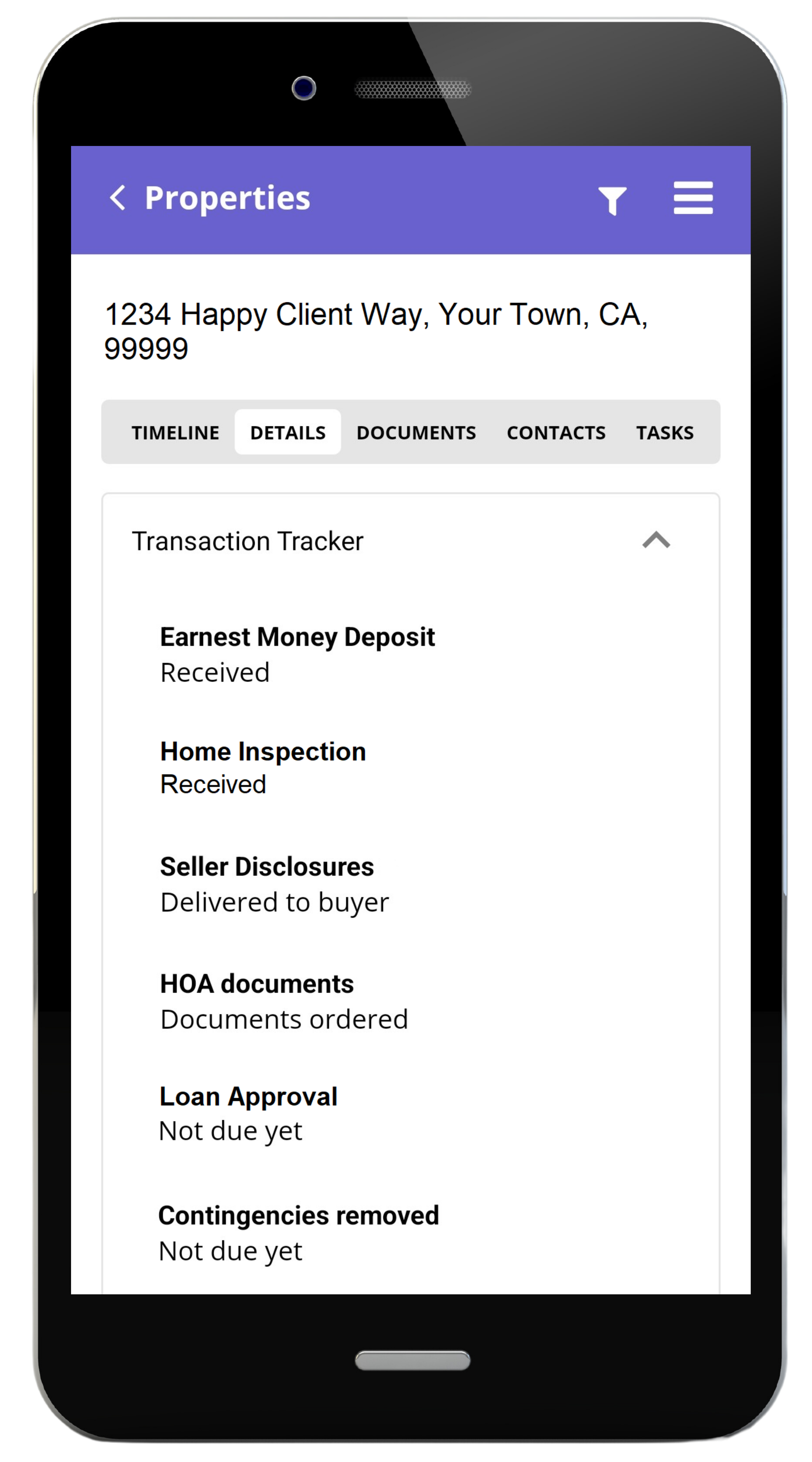 Keep your clients informed & updated in real-time. Includes Timeline, Transaction Tracker, Details, Documents, Contacts, & Tasks.