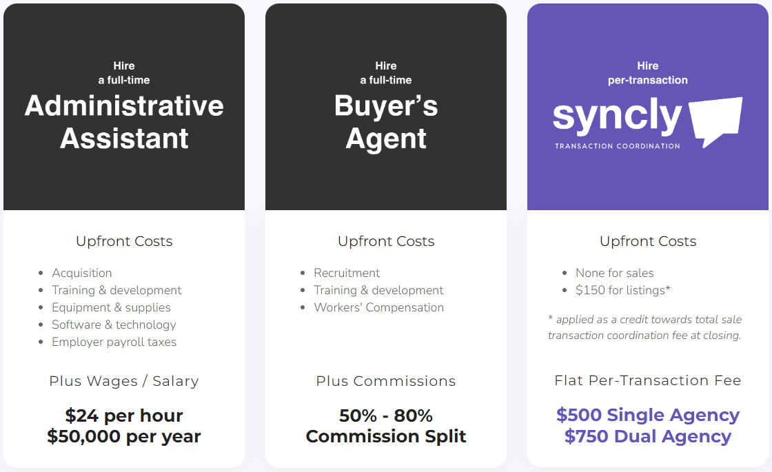 You get everything we offer with our full listing and sale transaction coordination service: our 12-pillar client journey, transaction app, marketing tools, and concierge services, all for one low, per-transaction fee. With Syncly, there is no need to hire and train an hourly or salaried assistant or bring on buyer's agents and sacrifice a significant portion of your commissions to free up your time to generate more business.